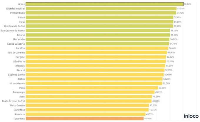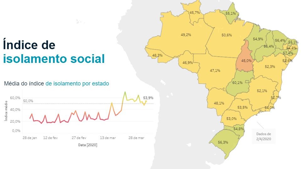 Goiás é o estado com o melhor índice de isolamento, com 60,14% das pessoas em casa. Em segundo lugar, o Distrito Federal tem índice de 57,58%, seguido por Pernambuco com 57,42%, Ceará com 56,40% e Piauí com 56,48%.