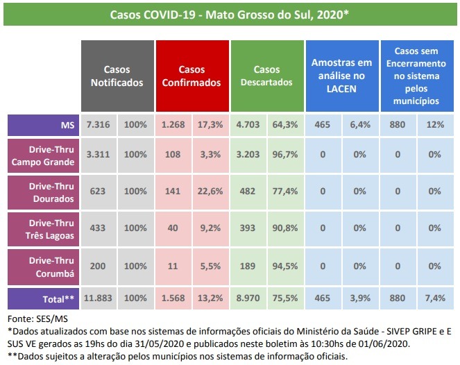 MATO GROSSO DO SUL (MS) – Com mais 79 exames positivos para coronavírus (Covid-19) nas ultimas 24 horas, o número de casos confirmados da doença no Estado chega a 1.568. As informações foram apresentadas nesta segunda-feira (01.06) em coletiva de imprensa online com autoridades do Governo do Estado.