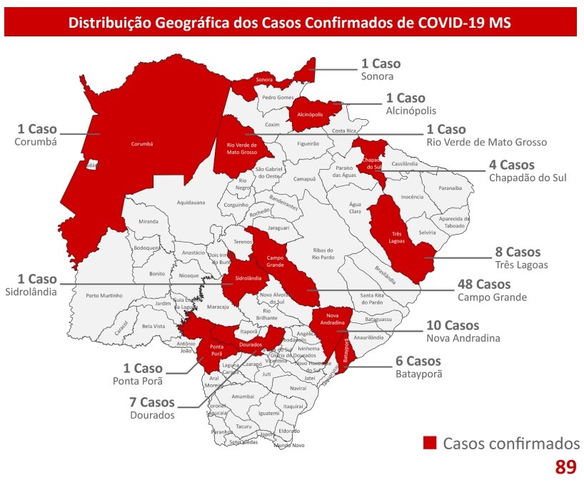 MS possui 89 infectados com a Covid-19 e 10 pacientes estão internados em UTI