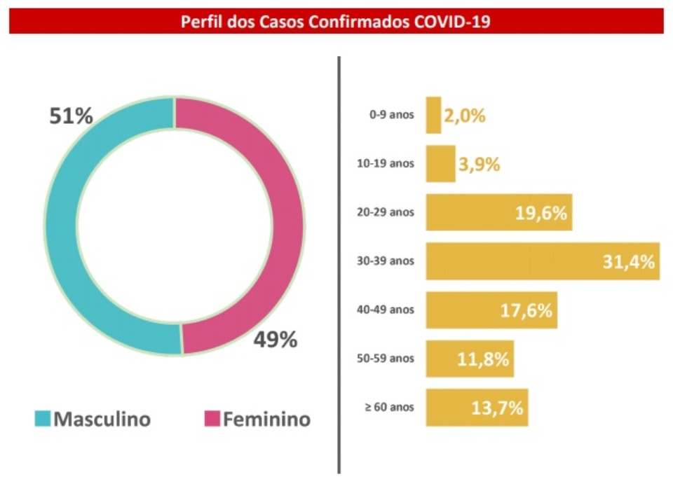O novo coronavírus continua a manter o perfil de paridade entre os sexos (com divisão de casos quase igual entre homens e mulheres) e acúmulo das confirmações entre adultos jovens, de 20 a 59 anos. A adjunta da SES alertou, porém, que 13,7% dos casos já envolve pacientes acima de 60 anos (7 no total, compreendendo um dos grupos de risco para a doença).