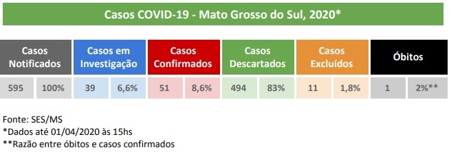 Segundo o boletim da SES, o Estado registrou nesta quarta-feira 595 notificações, com 51 casos confirmados e 494 descartados, além de 11 excluídos. Os registros confirmam uma morte até aqui –anunciada ontem, de Eleuzi Nascimento, de 64 anos, moradora de Batayporã, que foi internada em Nova Andradina e transferida para Dourados, onde faleceu. A paciente teve contato com uma parente, que vive na Bélgica, que teve confirmação de coronavírus.
