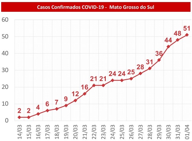 MATO GROSSO DO SUL – O Estado registrou até esta quarta-feira (1º) 51 casos confirmados de coronavírus, conforme boletim apresentado nesta tarde pela Secretaria de Estado de Saúde. O número representa um acréscimo de 3 casos sobre o total anunciado na terça-feira (31), quando foram confirmados 48 pacientes com a Covid-19. A secretária-adjunta de Saúde, Christinne Maymone, alertou, porém, que em uma semana, o total de casos confirmados duplicou no Estado.