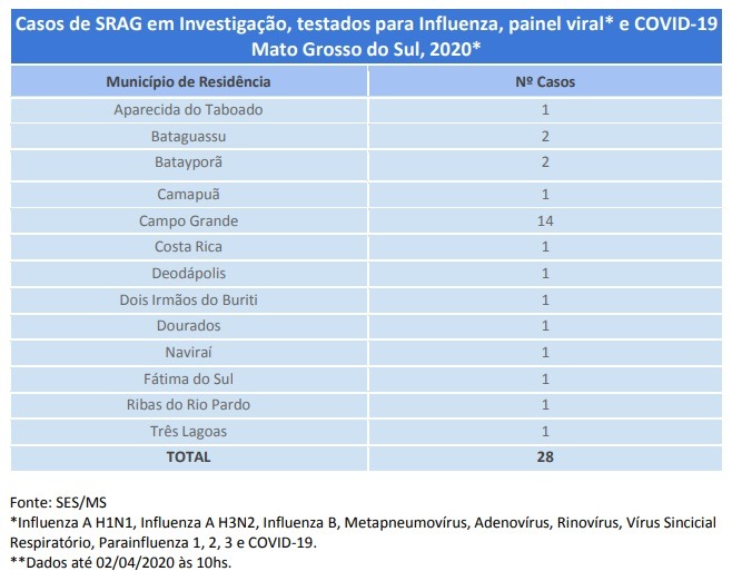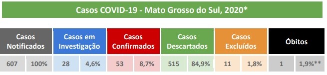 Segundo o boletim da SES, o Estado registrou nesta quinta-feira 607 notificações, com 53 casos confirmados e 515 descartados, além de 11 excluídos. Os registros confirmam uma morte até aqui –anunciada na quarta-feira (1º) de uma moradora (64) de Batayporã, que foi internada em Nova Andradina e transferida para Dourados, onde faleceu.