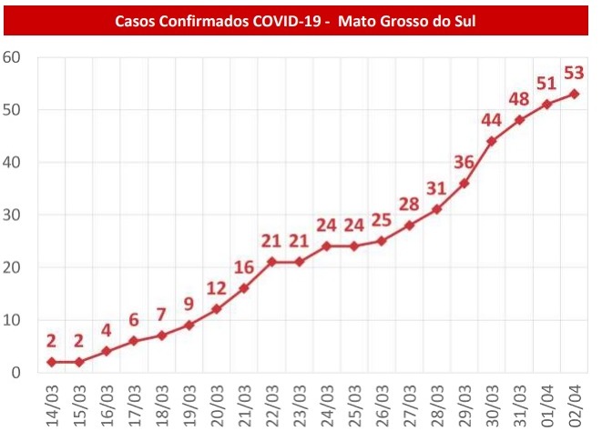 MATO GROSSO DO SUL – O Estado registrou até esta quinta-feira (2º) 53 casos confirmados de coronavírus, conforme boletim apresentado nesta tarde pela Secretaria de Estado de Saúde. O número representa um acréscimo de 2 casos sobre o total anunciado na quarta-feira (1º), quando foram confirmados 51 pacientes com a Covid-19. Os novos casos são de pacientes de Dourados e de Batayporã.