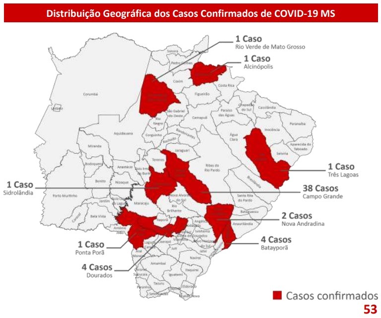 Segundo o boletim da SES, o Estado registrou nesta quinta-feira 607 notificações, com 53 casos confirmados e 515 descartados, além de 11 excluídos. Os registros confirmam uma morte até aqui –anunciada na terça, de Eleuzi Nascimento, de 64 anos, moradora de Batayporã (a 312 km de Campo Grande), que foi internada em Nova Andradina e transferida para Dourados, onde faleceu. A paciente teve contato com uma parente, que vive na Bélgica, que teve confirmação de coronavírus. Os dois novos casos são de Batayporã, contato com a paciente infectada e em Dourados, por viagem realizada a São Paulo e Paraná.