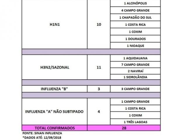 Boletim epidemiológico semanal da SES (Secretária Estadual de Saúde) divulgado na quarta-feira (12) apontou que de 34 amostras de sangue colhidas nos últimos 6 dias, apenas uma se confirmou para Infuenza A não subtipado. De janeiro até agora, 28 pessoas morreram em decorrência de algum vírus da doença.