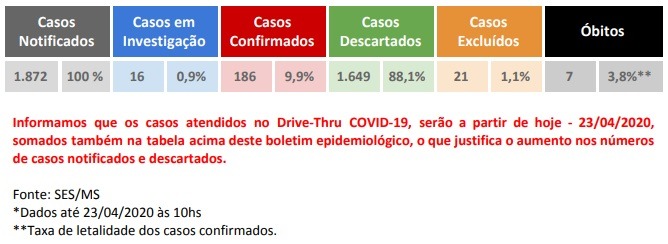 MATO GROSSO DO SUL – O Estado de MS registrou, até as 10h desta quinta-feira (23), 186 casos de coronavírus e sete mortes. Os dados constam em boletim da SES (Secretaria de Estado de Saúde) divulgado diariamente.