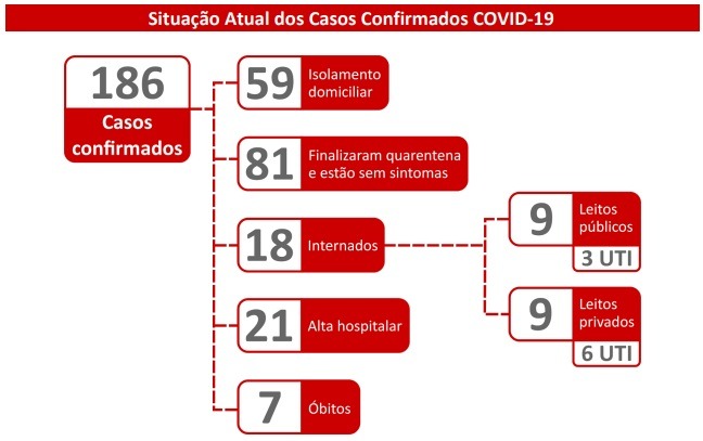 Dentre os casos confirmados, 59 foram submetidos ao isolamento domiciliar e 81 pacientes finalizaram a quarentena e não apresentam sintomas. Ainda há 18 pacientes internados,. Houve, ainda, 19 pacientes em alta hospitalar, além dos sete óbitos.