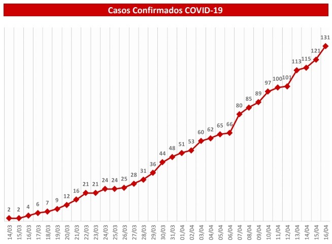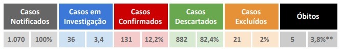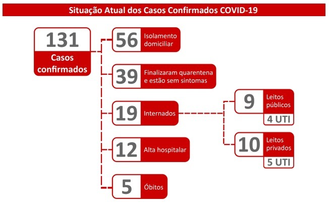 Dos 131 casos confirmados, 56 estão em isolamento domiciliar, 39 já finalizaram a quarentena e estão sem sintomas. 19 estão internados, sendo nove em hospitais públicos e dez em hospitais privados. doze pacientes tiveram alta hospitalar e foram registrado cinco óbitos.