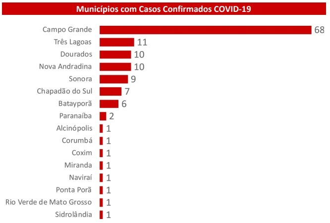 A SES confirmou 7 novos casos da doença em Campo Grande, que agora soma 68. Foi confirmado também o primeiro registro em Miranda. Outros 14 municípios do estado também tem casos: Três Lagoas, com 11, Nova Andradina e Dourados com 10; Sonora com 9; Chapadão do Sul com 7; Batayporã, com 6; Paranaíba, com 2 e Alcinópolis, Corumbá, Naviraí, Ponta Porã, Rio Verde de Mato Grosso e Sidrolândia, com 1 registro cada.