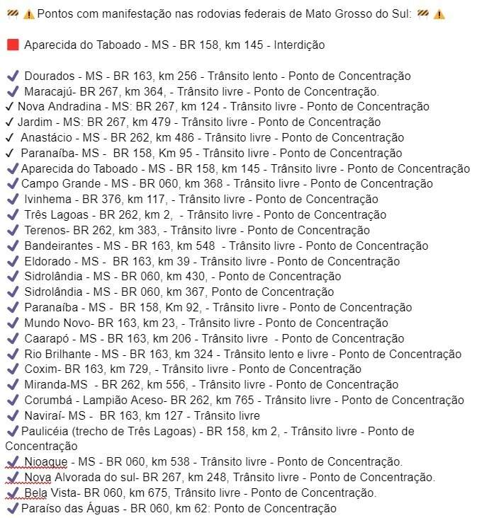 O último boletim atualizado da PRF (Polícia Rodoviária Federal) em Mato Grosso do Sul apontou que ainda na tarde desta quarta-feira (2), apenas um trecho de rodovia federal segue interditado. Nas rodovias estaduais, não há bloqueios, mas manifestações estão mantidas em alguns pontos.