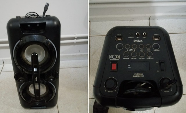Após persistência em permanecer com o som ligado, foi necessário intervenção do policial Garcia para desligar o aparelho. Trata-se de um aparelho de som da marca PHILCO, modelo (Caixa Acústica PHT5000). O equipamento em questão ostenta uma potência real de aproximadamente 150w que, em seu volume máximo proporcionada incômodo, considerando o horário em que estava sendo operado.