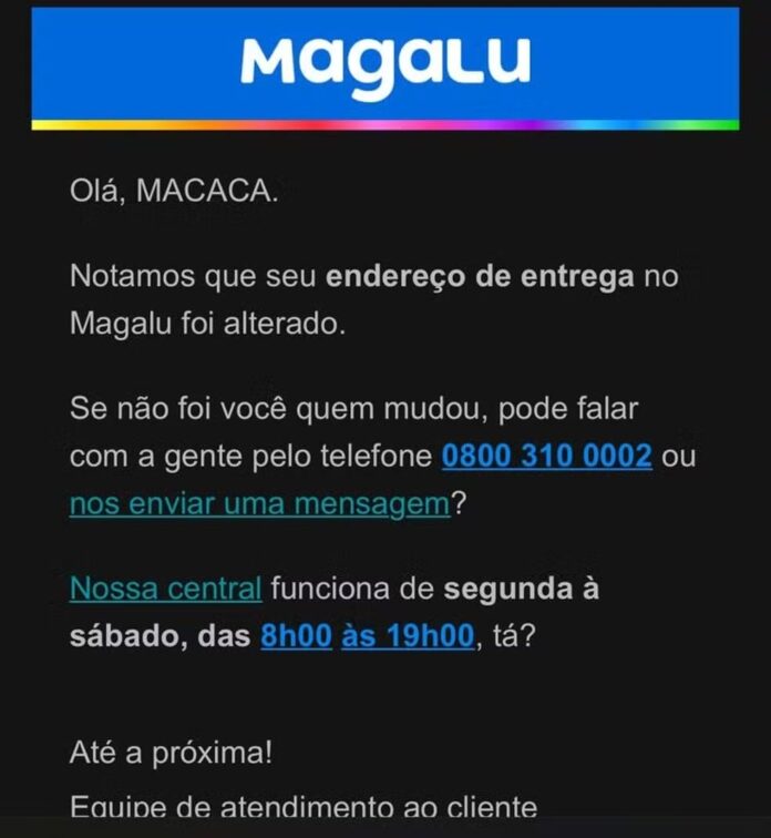 Uma cozinheira de 35 anos, residente em São Paulo, foi alvo de injúria racial ao receber um e-mail de confirmação de atualização de cadastro da loja Magazine Luiza no último sábado (04/01). A mensagem iniciava com a saudação: “Olá, macaca”.