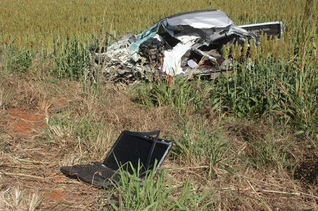 A S-10 ficou destruída, saiu da pista e parou em uma lavoura de sorgo, com a vítima presa ao cinto de segurança.