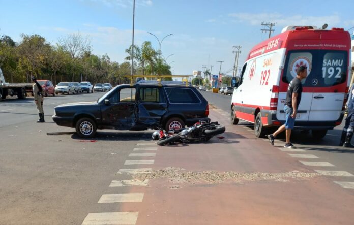 Por volta das 9h30, uma motocicleta CB300, conduzida por uma mulher acabou por colidir na lateral de um Del Rey preto que fazia uma conversão na avenida sentido bairro/centro.