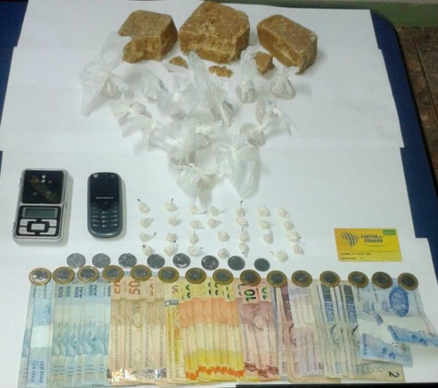 A mulher foi presa em flagrante por crime de tráfico. Foi apreendida toda a droga, dinheiro, celular e uma balança.
