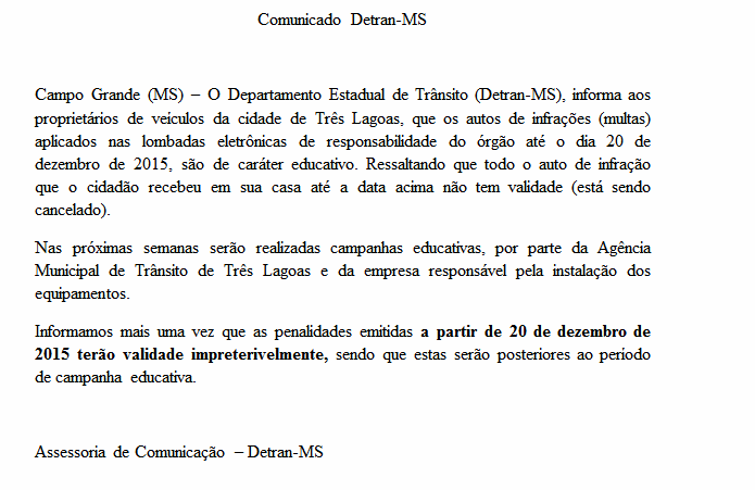 O departamento estadual ainda ressaltou que todo o auto de infração que o cidadão três-lagoense ou de outras cidades receberam em suas casas até a data acima não terá validade e precisa ser cancelada junto ao DEPTRAN de Três Lagoas.