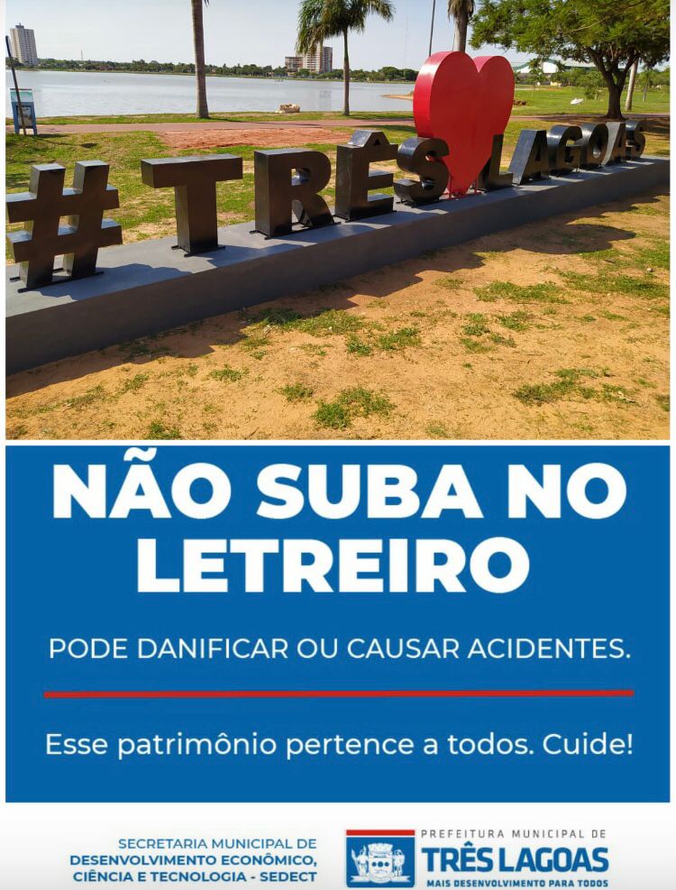 Com menos de uma semana de inauguração, o letreiro #TrêsLagoas já está sendo alvo de mau uso por parte de algumas pessoas e a Prefeitura Municipal emitiu um alerta para que ao tirar fotos no novo ponto turístico, que não subam no letreiro pois o mesmo pode ser danificado.