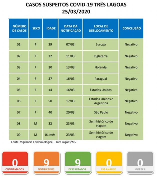 Os últimos três casos que aguardavam o resultado, sendo eles o de uma mulher de 40 anos; um homem de 32 e um bebê de um mês deram negativo. Sendo assim, Três Lagoas se mantém com nenhum caso positivo de Coronavírus.