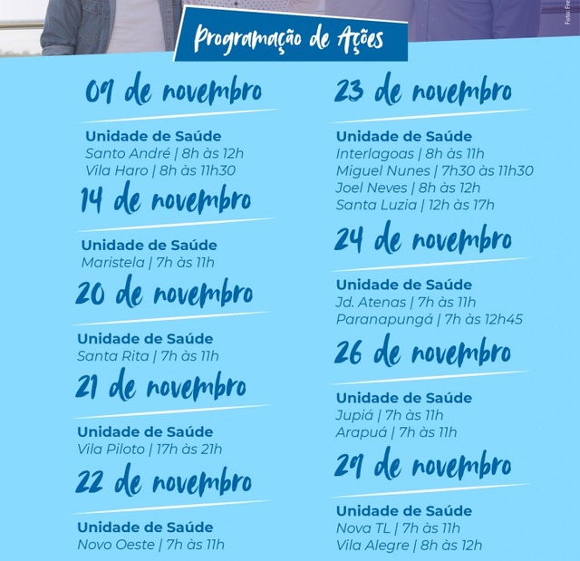 Em seguida, como consta na programação do Novembro Azul, no dia 20 (quarta-feira), das 7h às 11h, são convidados os homens que residem na área de abrangência da unidade de Saúde Santa Rita.