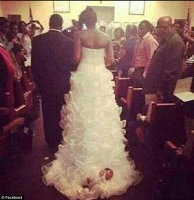 Apesar de alguns rituais em cerimônias de casamento saírem um pouco do comum, uma noiva americana chocou ao escolher uma forma inusitada de integrar a filha de apenas um mês na cerimônia de casamento. Shona Carter-Brooks prendeu a menina à cauda do seu vestido de noiva, e a recém-nascida foi arrastada pelo chão da igreja até o altar.