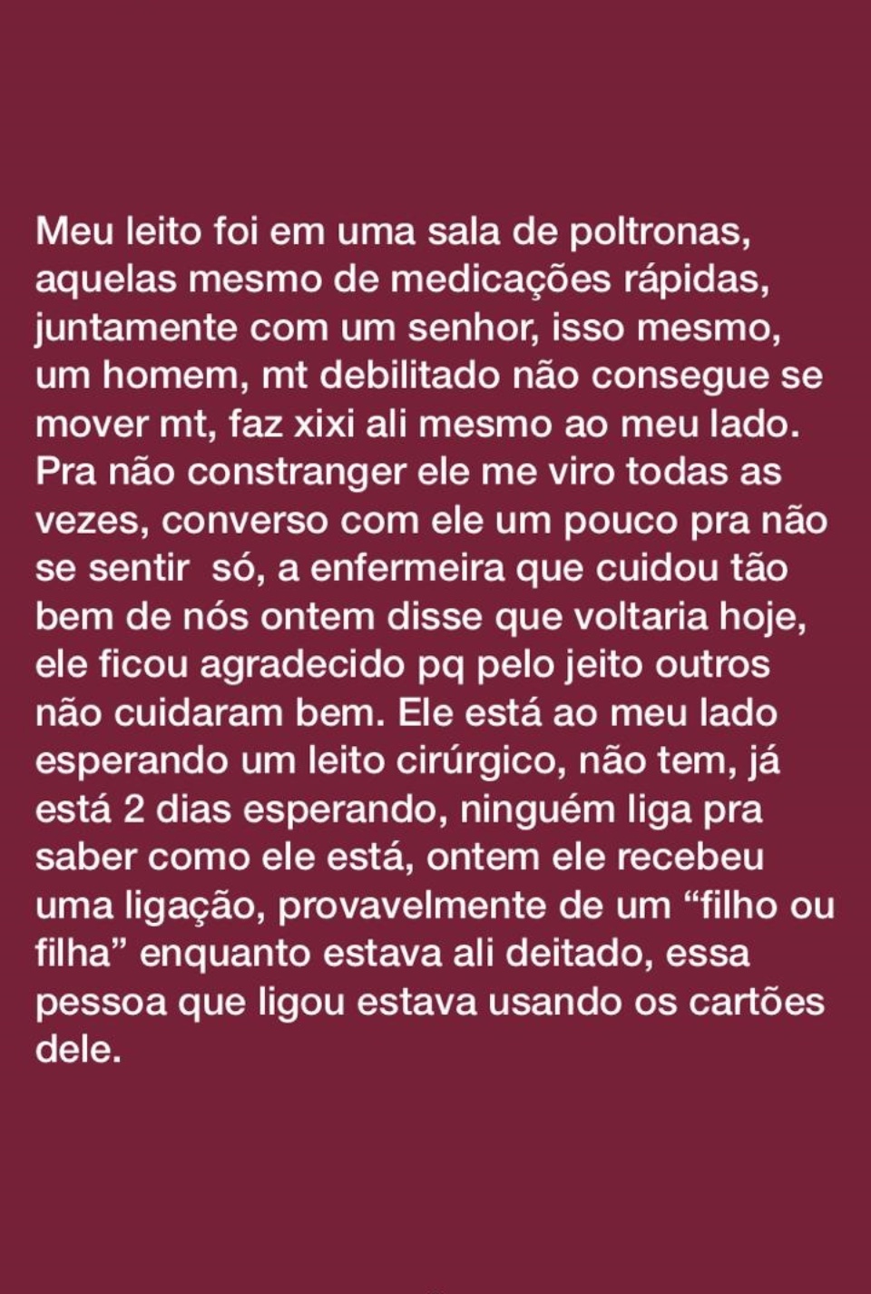 TRÊS LAGOAS (MS) – Na manhã desta segunda-feira (29) a manicure três-lagoense Vitória Ananias, internada com suspeita de inflamação do apêndice, fez um relato emocionante sobre a rotina de quem se encontra internado em alguma unidade de saúde em Três Lagoas (MS). “Nos corredores se ouve choros de familiares e até mesmo da equipe médica”, escreveu em suas redes sociais.