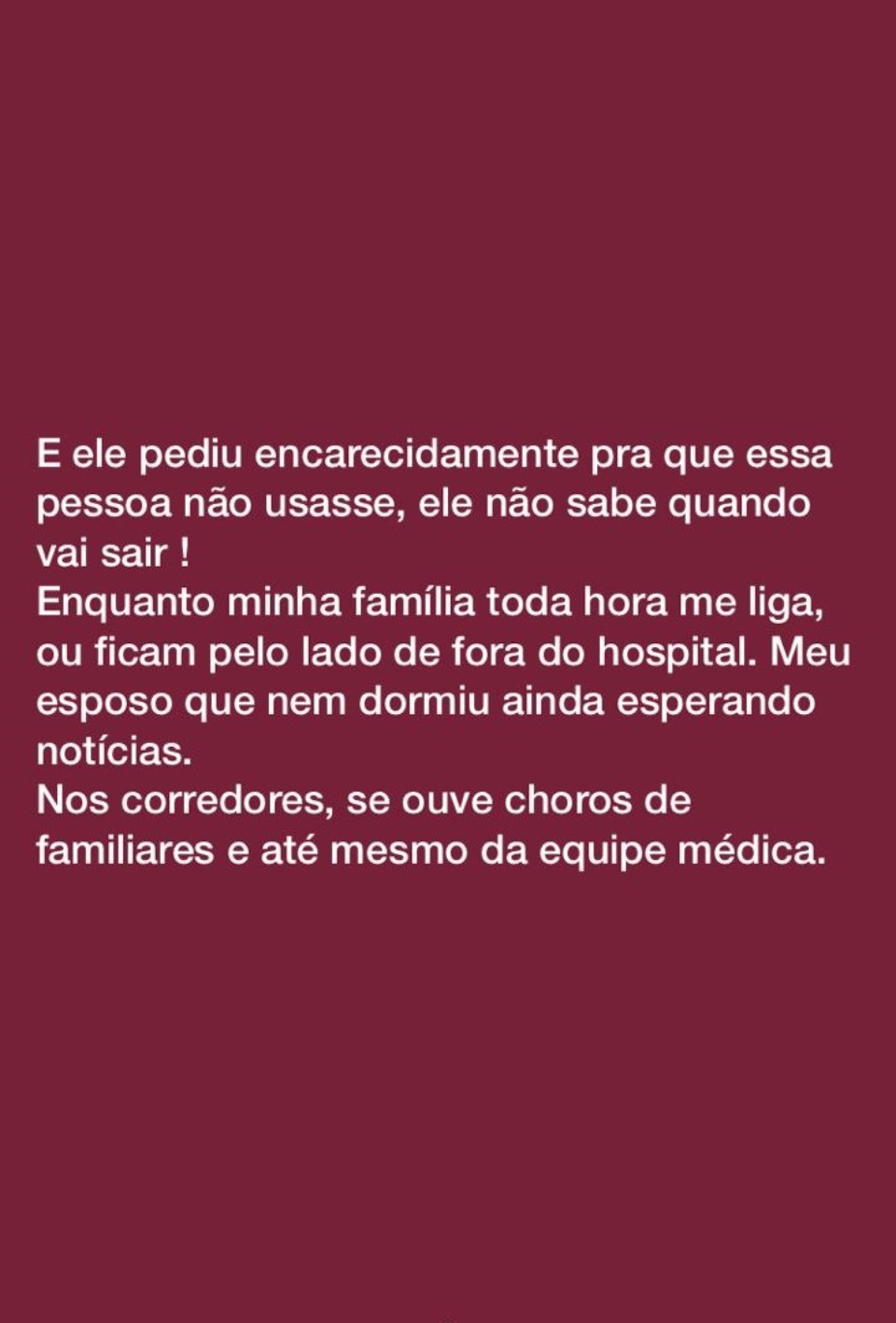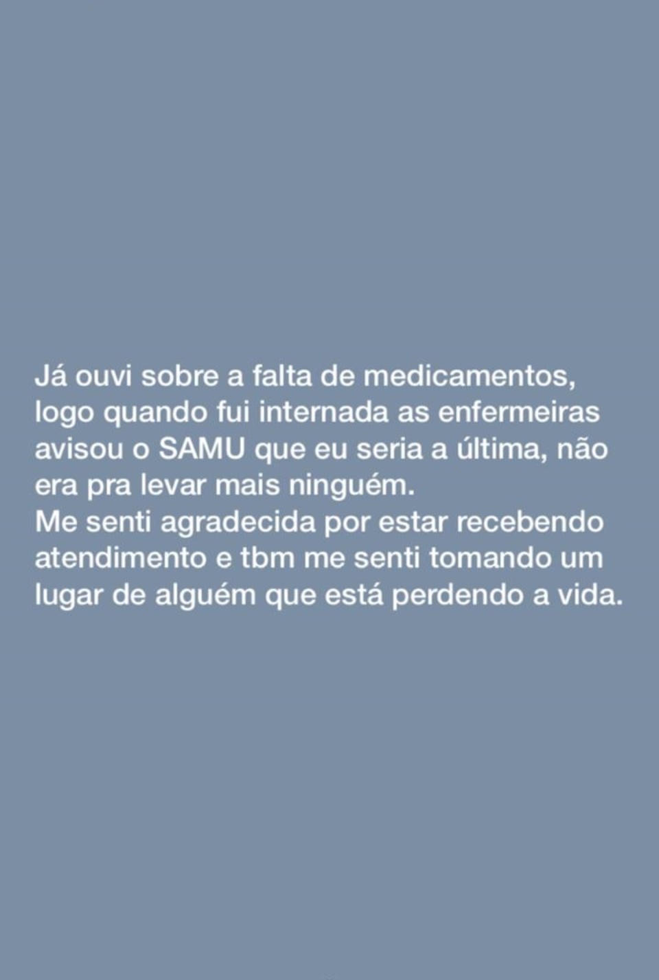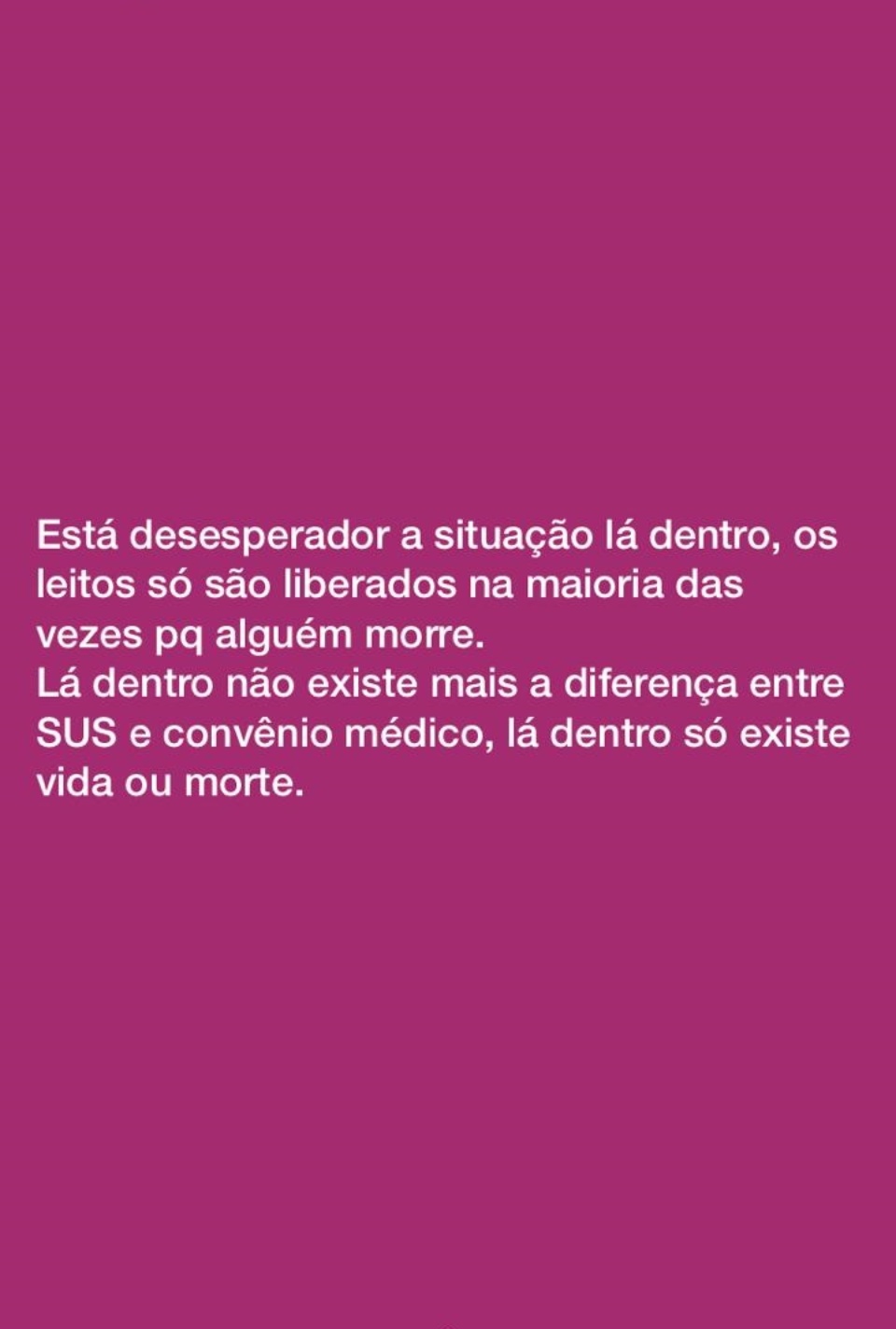 Ela também fez um alerta para a população de Três Lagoas (MS): “Está desesperadora a situação lá dentro, os leitos só são liberados na maioria das vezes porque alguém morre. Lá dentro não existe mais a diferença entre SUS e convênio médico, lá dentro só existe vida ou morte”.