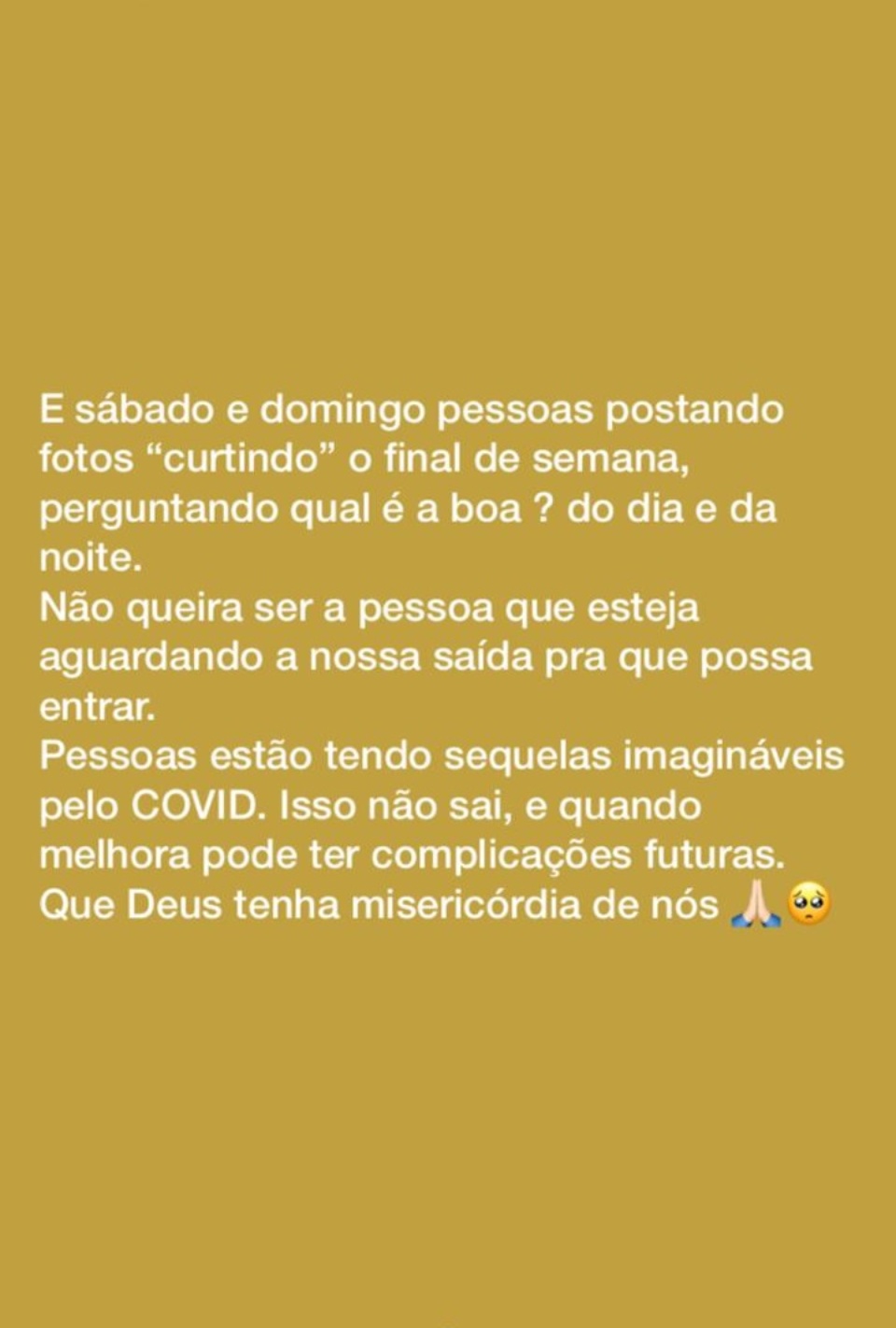 “E sábado e domingo as pessoas ficam postando fotos ‘curtindo’ o final de semana, perguntando qual é a boa do dia e da noite. Não queira ser a pessoa que está aguardando a nossa saída para entrar. Pessoas estão tendo sequelas inimagináveis pela Covid”, disse.