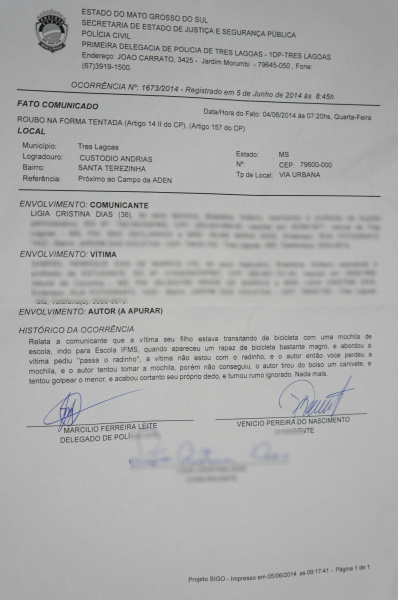 De acordo com informações do boletim de ocorrência o garoto estava trafegando pela via citada em sua bicicleta, com a mochila repleta de materiais escolares, quando um outro individuo o abordou e tentou roubar sua mochila, diante das negativas do adolescente o autor o atacou com um canivete, porém, ele mesmo acabou se ferindo, fugindo logo em seguida.