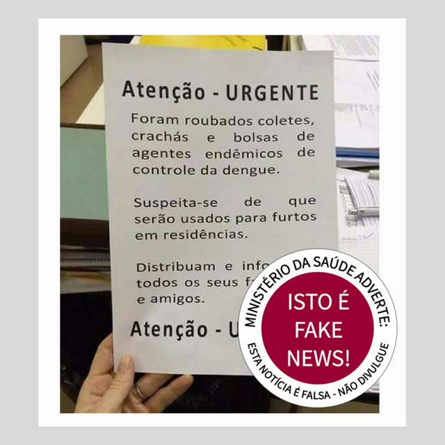 Essa “Fake News” é antiga e surgiu, pela primeira vez, em 2015, e, periodicamente, desde então, volta a ser publicada nas redes sociais. Em Três Lagoas, os Agentes de Endemias, não os “Agentes Endêmicos”, como consta na “Fake News”, não usam jaleco, mas apenas camisetas ou camisas uniformizadas e crachás funcionais.