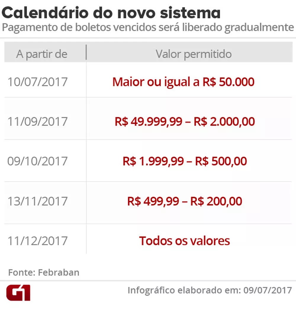 A mudança será gradual para diferentes valores. As contas atrasadas abaixo R$ 50 mil e acima de R$ 2 mil só serão liberadas para pagamento em qualquer banco no dia 11 de setembro. O cronograma prevê que até dezembro todos os boletos com atraso, de qualquer valor, sejam aceitos em todos os bancos.