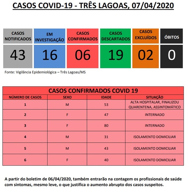 TRÊS LAGOAS (MS) – A Secretaria Municipal de Saúde (SMS) de Três Lagoas, por meio da Vigilância Epidemiológica, divulgou nesta terça-feira (07) o mais novo boletim epidemiológico para Covid-19 (Coronavírus) e que aponta 11 novos casos notificados como suspeitos, passando de 32 para 43 notificações.