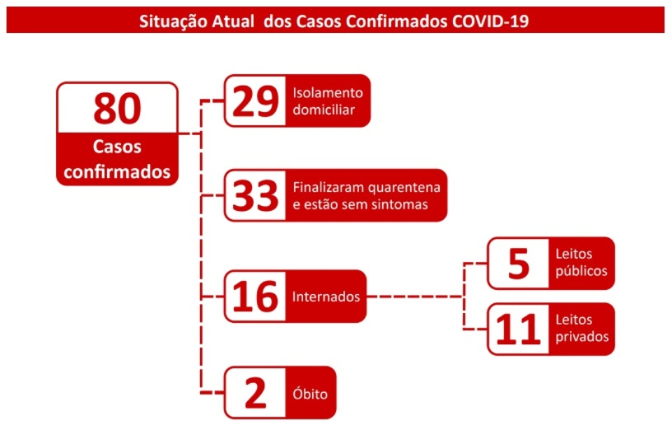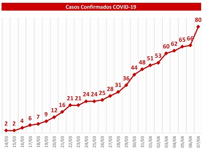 O número passou de 66 para 80 positivos em apenas 24 horas. São 14 a mais que ontem, média bem superior a evolução das primeiras semanas da pandemia no Estado, com média de 2 casos novos ao dia.