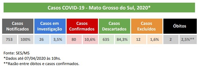O boletim traz 753 notificações e 26 casos ainda em investigação, além dos 2 óbitos das mulheres de 64 e 66 anos de Batayporã.