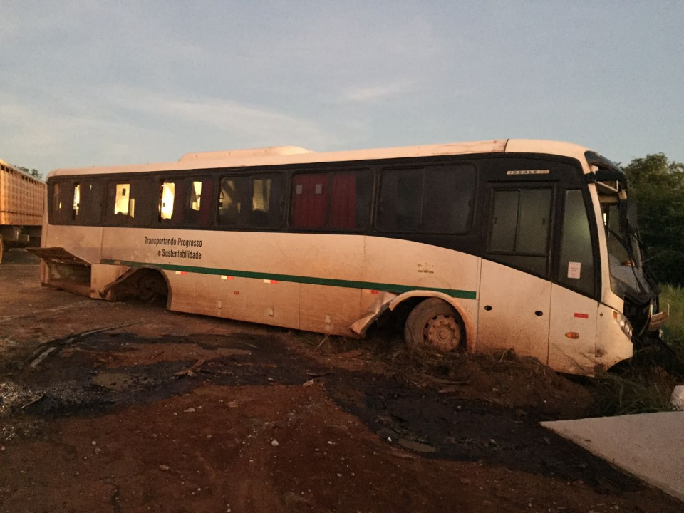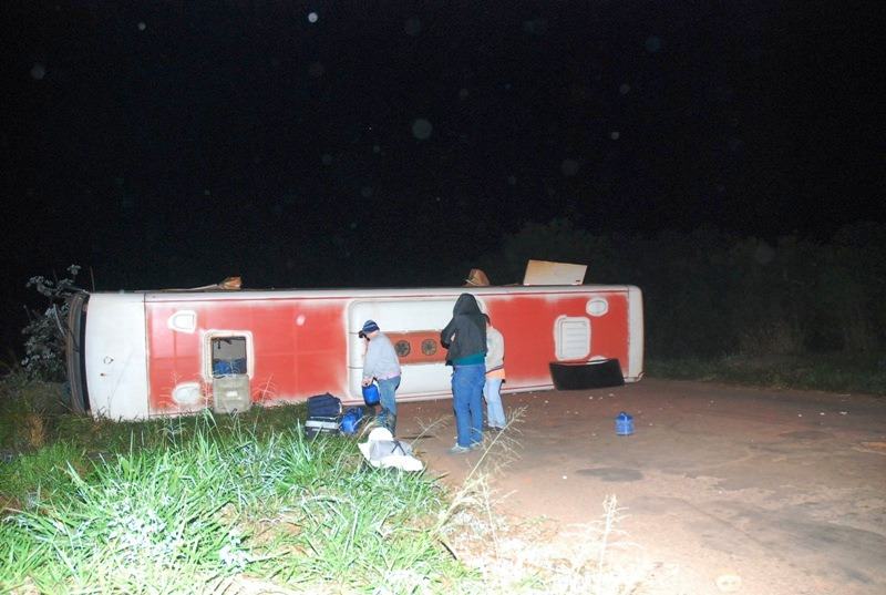 Um ônibus que realizava o transporte de trabalhadores para o corte de eucalipto na região de Santa Rita do Pardo, tombou durante a madrugada desta segunda-feira (26) na MS-395.