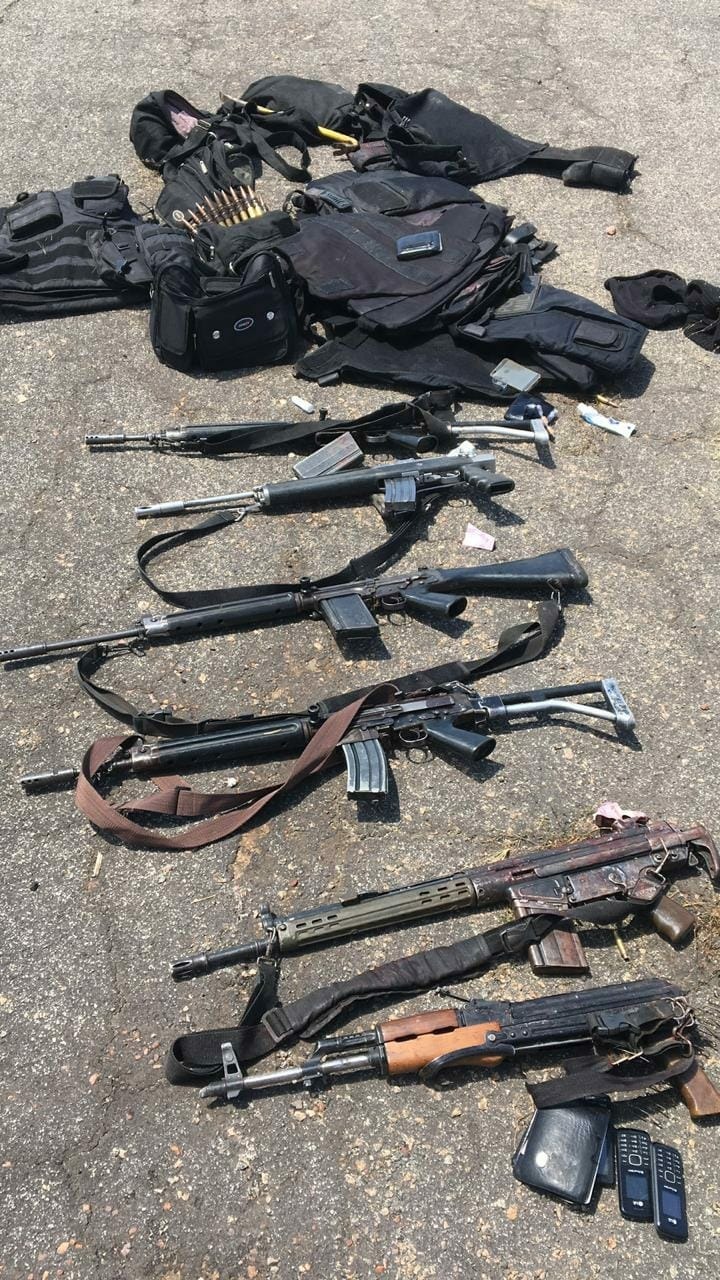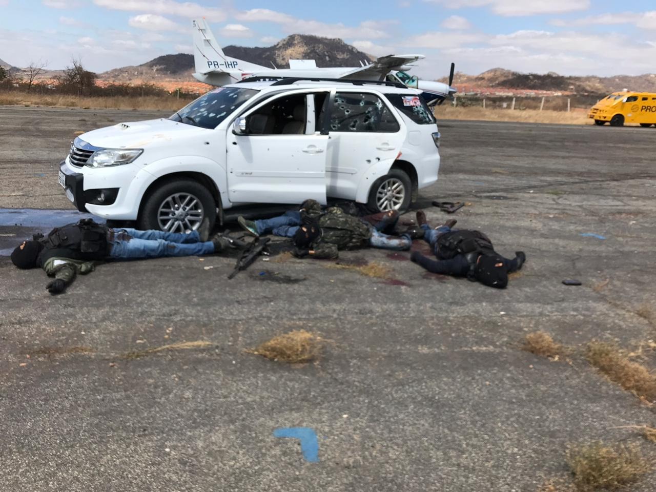 Com os suspeitos mortos, a polícia encontrou seis fuzis AK 47 e uma metralhadora ponto 50 que estava instalada em um dos veículos utilizados. A polícia disse que continua realizando buscas por outros integrantes da quadrilha. O piloto do avião foi socorrido e, conforme informações do hospital, está em condições estáveis.