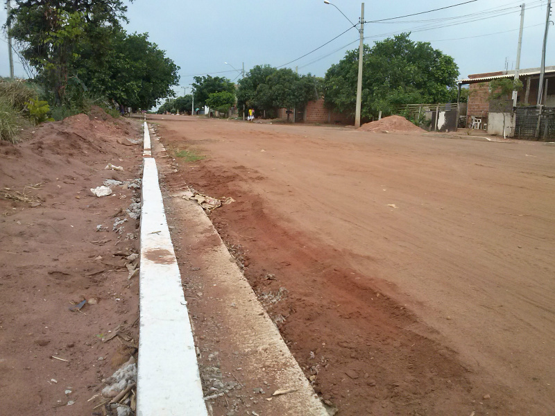 Conforme indicam as imagens, nas principais ruas do bairro Jardim Oiti guias feitas com concreto foram instaladas para a comunidade.