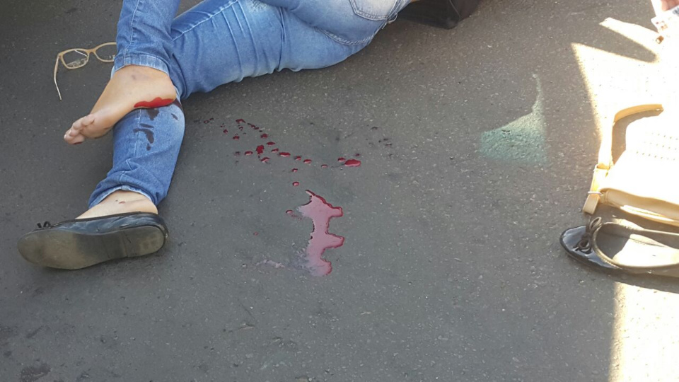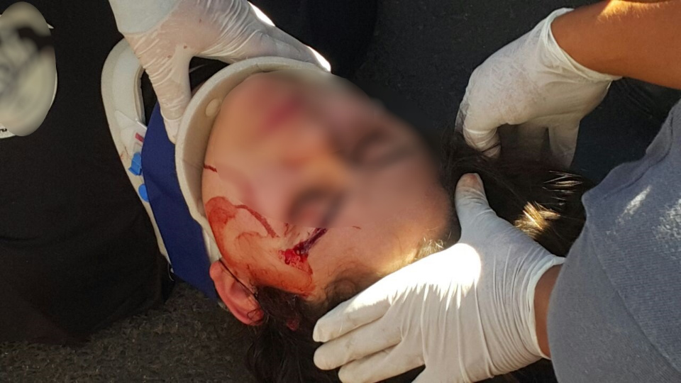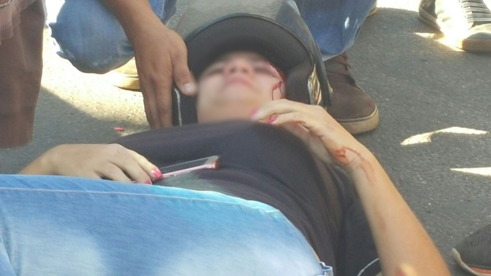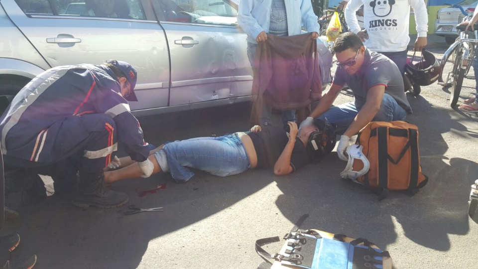 Devido ao impacto a motociclista foi arremessada ao solo e teve um corte no supercílio e pé esquerdo, com uma luxação.