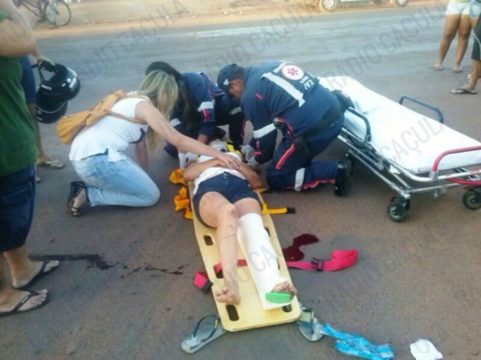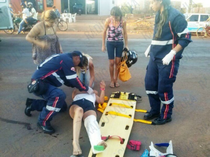 Uma motociclista teve ferimentos graves após se envolver em um acidente em um dos pontos mais movimentados de Três Lagoas, na região do Condomínio Novo Oeste, no Jardim Carandá.
