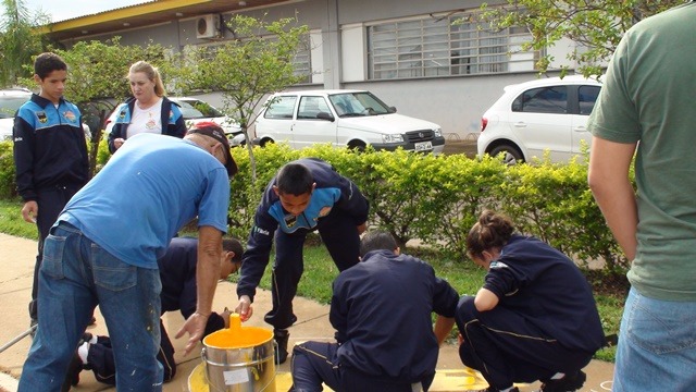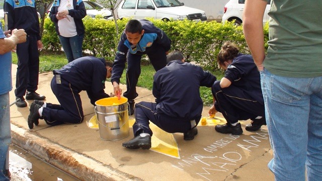 Nesta manhã as crianças distribuíram aos motoristas que passavam pela blitz panfletos explicativos e fitas com o logo da campanha alem de terem realizado a pintura da calçada com o símbolo da campanha.