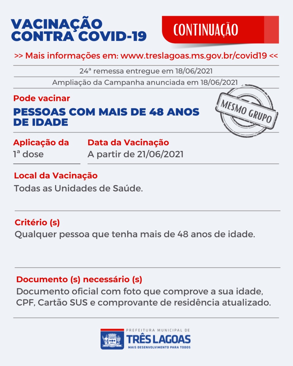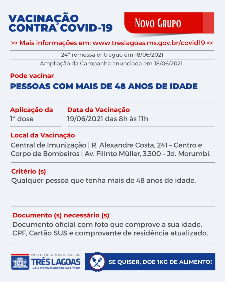 Neste sábado (19), das 8h às 11h, todas as pessoas com mais de 48 anos poderão se imunizar em dois locais de vacinação, na Central de Imunização que funciona no prédio da Biblioteca Municipal Rosário Congro localizado a Rua Alexandre Costa, 241 – Centro (Circular da Lagoa Maior) e, simultaneamente, na sede do 5º Grupamento do Corpo de Bombeiros de Três Lagoas, localizado na Avenida Filinto Müller, 3.300 – Jardim Morumbi.