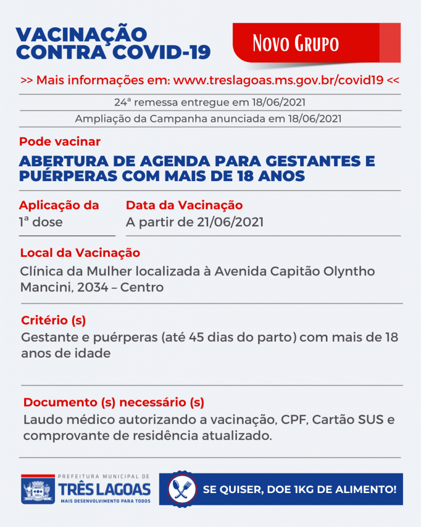 A partir de segunda-feira (21), será aberto o agendamento para gestante e puérperas (até 45 dias do parto) com mais de 18 anos de idade. Essas, poderão agendar dia e hora na Clínica da Mulher localizada à Avenida Capitão Olyntho Mancini, 2034 – Centro. Para o agendamento, é necessário apresentar laudo médico autorizando a vacinação, CPF, Cartão SUS e comprovante de residência atualizado.