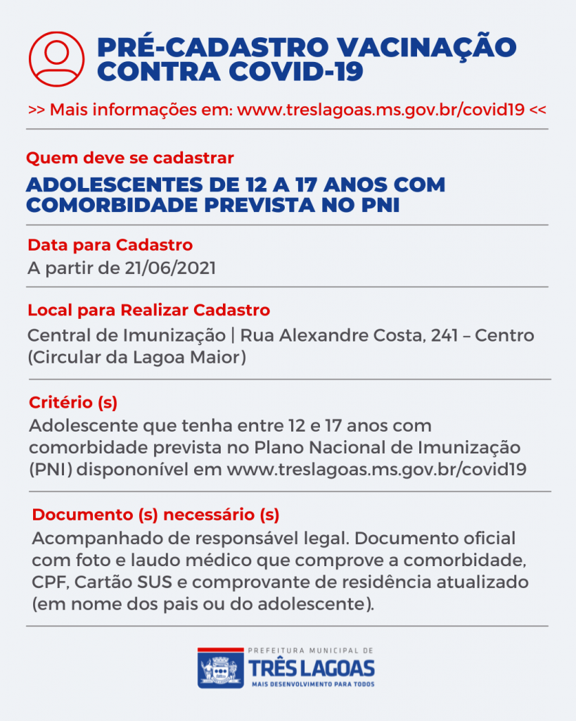 Para esse cadastro, os que se enquadram devem comparecer, acompanhados de responsável legal, na Central de Imunização que funciona no prédio da Biblioteca Municipal Rosário Congro localizado a Rua Alexandre Costa, 241 – Centro (Circular da Lagoa Maior) a partir de segunda-feira (21) portando documento oficial com foto e laudo médico que comprove a comorbidade prevista no PNI, CPF, Cartão SUS e comprovante de residência atualizado (em nome dos pais, caso não tiver no nome do adolescente).