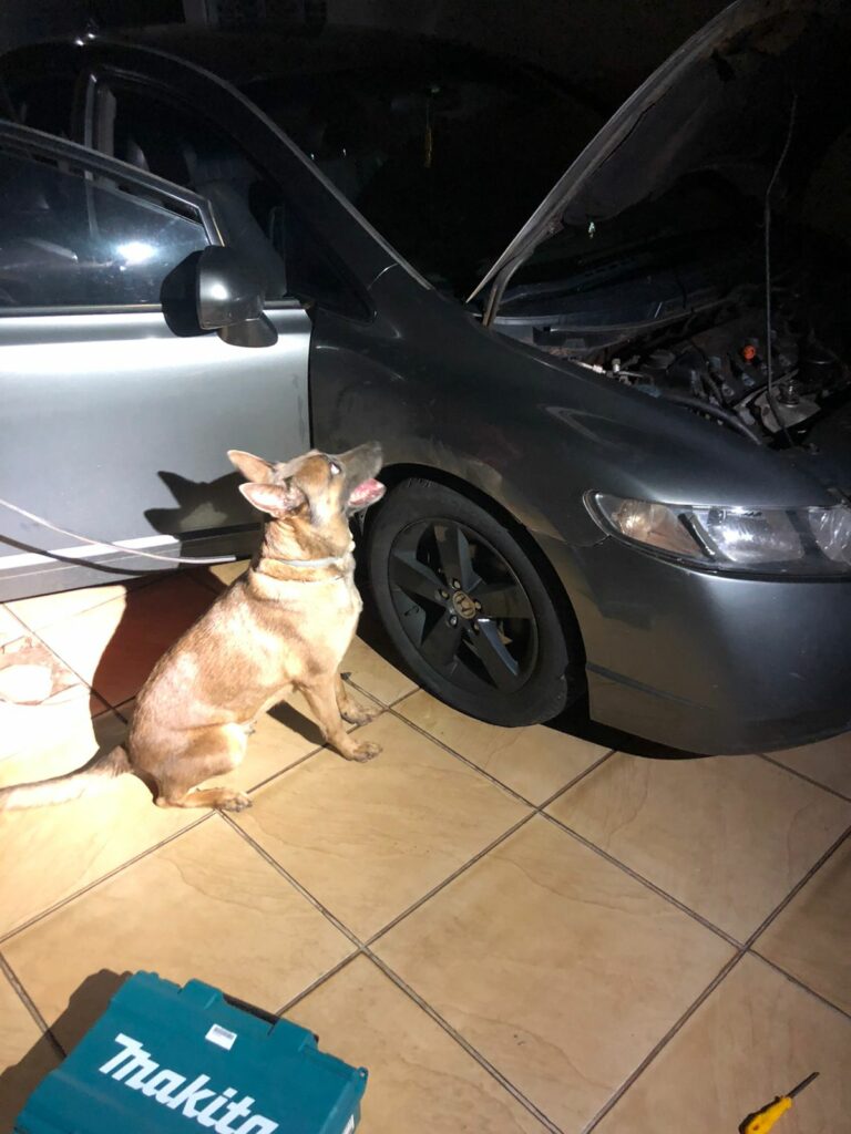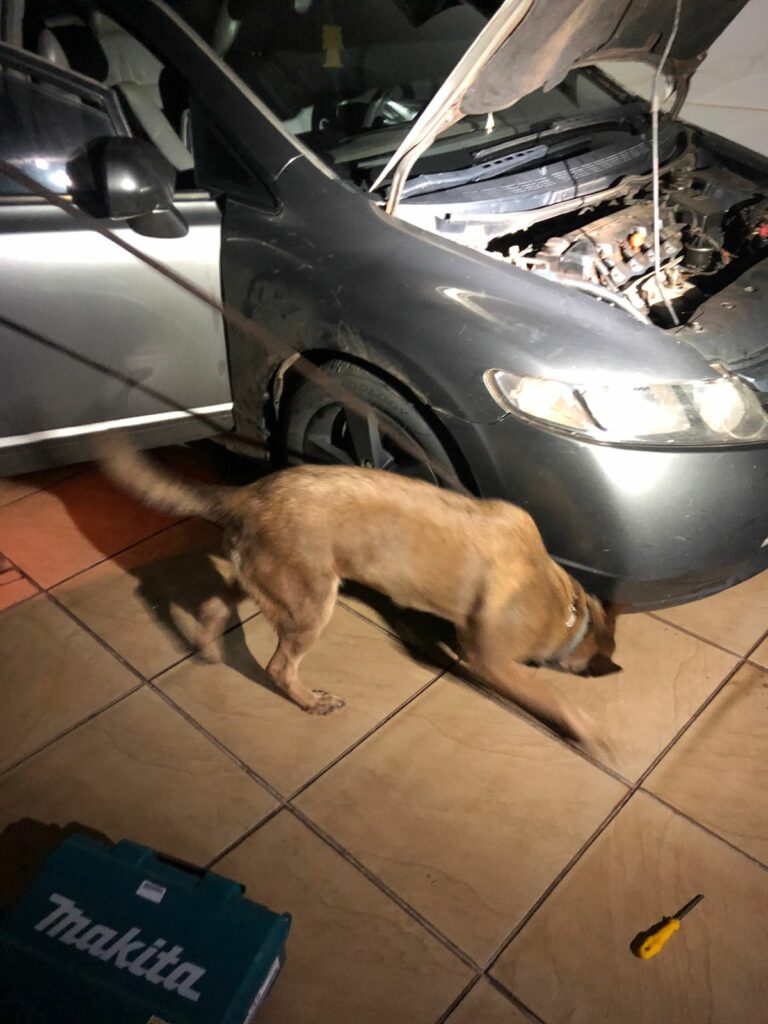 Em vistoria veicular, com auxílio de cão detector de droga, foram encontrados diversos tabletes de cocaína escondidos em compartimentos ocultos preparados para este fim, pesando aproximadamente 42 kg.