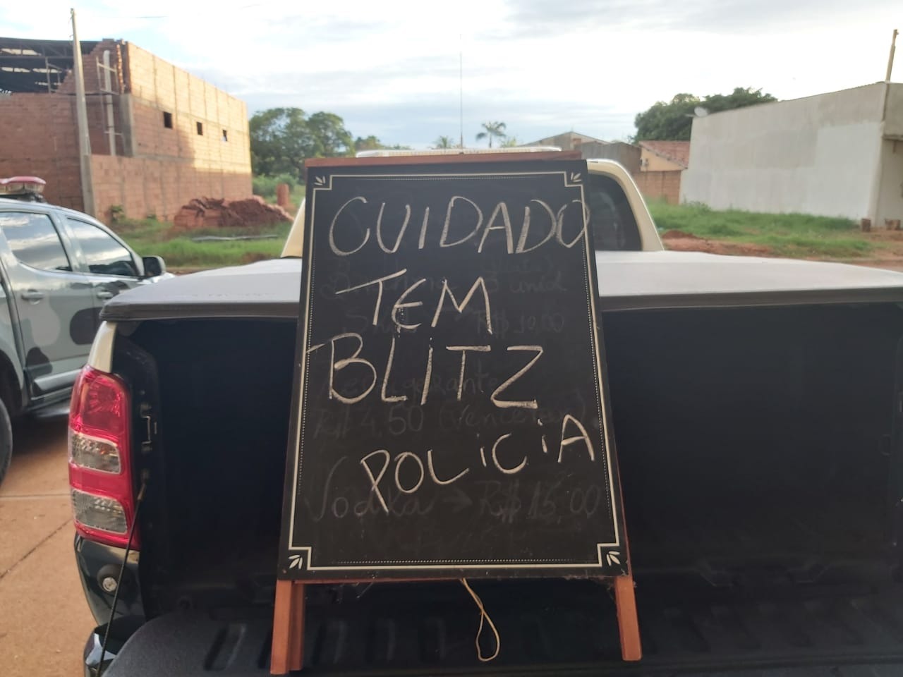 Placa improvisada avisava condutores de veículos onde estaria acontecendo uma blitz