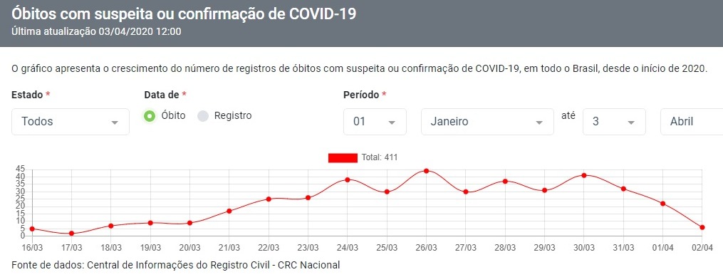 Os dados totalizados pelos cartórios somavam, às 12h00 (horário de Brasília-DF) de hoje (3), 411 óbitos suspeitos ou confirmados para o novo coronavírus. De acordo com os dados divulgados pelo Ministério da Saúde, no fim da tarde de ontem (2) o Brasil tinha confirmado 299 mortes pela doença.