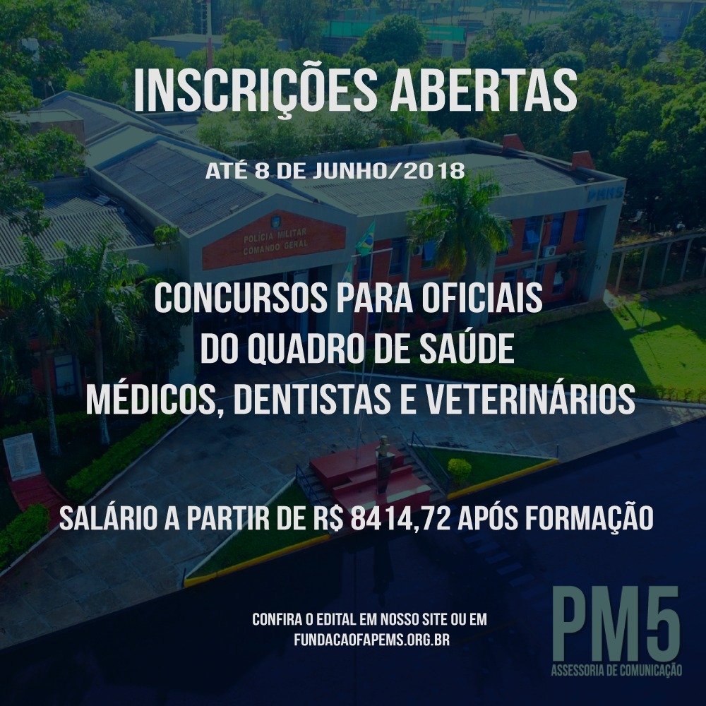 Na manhã de hoje (15/05), a Secretaria de Estado de Administração e Desburocratização republicou o Edital para o concurso de ingresso no Curso Básico de Formação de Oficiais de Saúde da Polícia Militar de Mato Grosso do Sul, e posterior investidura no cargo de Oficial de carreira do Quadro de Saúde, para médicos, dentistas e médicos veterinários, totalizando 12 vagas, sendo: