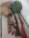Foram apreendidos: uma espingarda Calibre 36 sem marca e com numeração raspada; uma espingarda do tipo puxa-saco (bacamarte) sem marca e numeração; 100 gramas de pólvora e 600 gramas de chumbo; 500 metros de redes de pesca, 30 anzóis de galho e um animal silvestre da espécie Cateto.