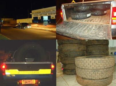 Logo em seguida, uma caminhonete Amarock, placa de Ponta Porã (MS), que em seu compartimento de cargas foram encontrados 4 pneus.