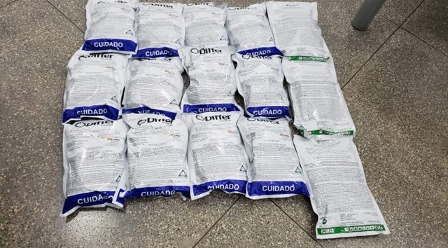 Policiais Militares Ambientais de Naviraí realizavam fiscalização na rodovia MS-180 e abordaram na terça-feira (9) à noite um veículo Ford Ranger, conduzido por um homem de 24 anos, residente em Mundo Novo. Na vistoria no interior do veículo foram encontrados agrotóxicos contrabandeados.